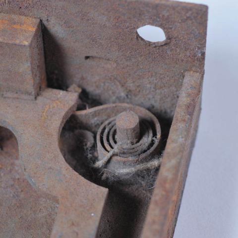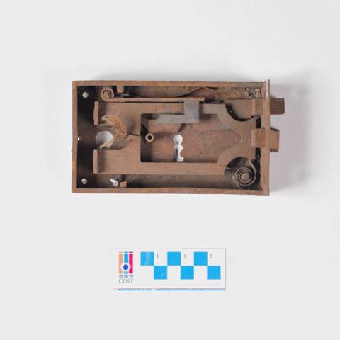 Cerradura de formato rectangular, tiene orificio para insertar la llave en la parte central. A la derecha tiene orificio circular.