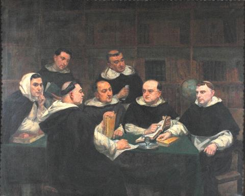 Conjunto de siete personajes masculinos reunidos en torno a una mesa con libros, personaje principal sostiene e indica una página. Visten hábito blanco y negro y el cabello cortado en cerquillo. En el plano posterior, se aprecia estanterias con libros.