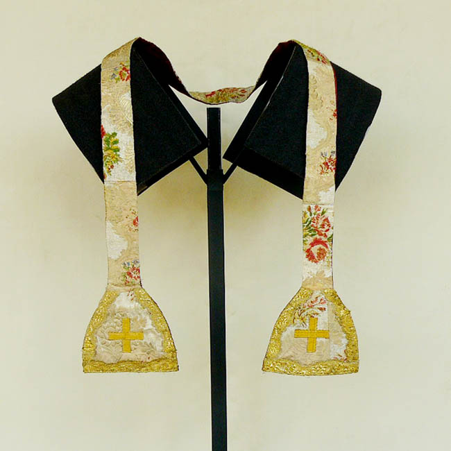 Vestimenta litúrgica, es una banda confeccionado en tela tejida de flores, ramilletes aislados, de color rosado y plateado Los extremos son más amplios y presentan la aplicación de una cruz central confeccionada en cinta amarilla y en los bordes una pasamanería ancha, dorada, metálica. Interior tela magenta. La tela presenta un diseño vegetal, flores de aspecto mullido, organizada e forma longitudinal por serpentina dorada en relieve sobre fondo de hilos metálicos paleteados y tela rosada plana.