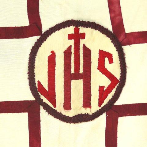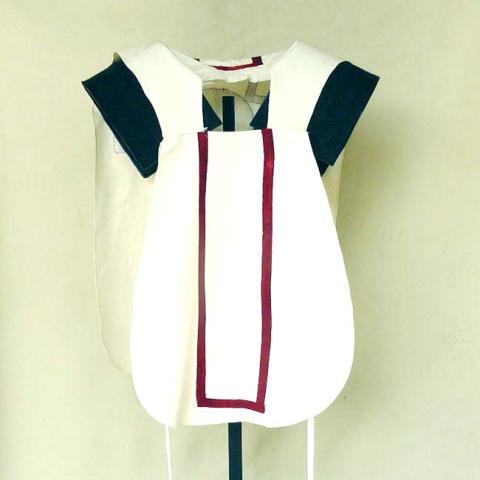Vestimenta liturgica, confeccionada en tela blanca, formada por dos piezas, unidas en solo en los hombros, delantero periforme, mas pequeño que la espalda, en corte recto; esta presenta una gran cruz de cinta color rojo oscuro y al centro, bordada, las letras JHS. La misma cinta forma un rectángulo central en el delantero. Interior, tela blanca.