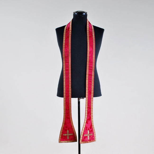 Textil cosido de damasco de seda color rojo con aplicación de galón dorado, rosa y café. Banda de tela roja, estrecha y más ancha en las puntas, donde presenta al centro una cruz confeccionada en cinta. Los bordes presentan una delgada franja confeccionada con la misma cinta de color amarillo y ocre en diseño menudo de cardos y espinas. Reverso, tela roja.