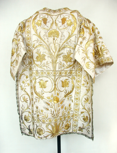 Textil cosido de lamé de color blanco con bordados en relieve de hilo de oro y aplicación de galones dorados y mostacillas. Túnica abierta a los lados, de mangas anchas; confeccionada en tela blanca, tiene rebaje del cuello circular con pequeñas aberturas a cada lado, cerradas con argollas y cintas. Ambas piezas son muy similares están cubiertas de bordados en hilo metálico dorado, en diseño vegetal; al centro superior destaca un clavel, uvas y roleos. Los bordes inferiores tienen aplicación de blonda dorada metálica. Interior, tela gris a blanca.