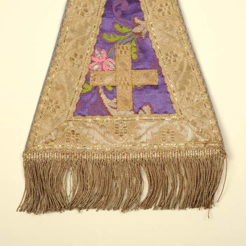 Textil cosido de brocado de color bordados en violeta con colores verde, fucsias, lilas y dorados, con aplicación de galón dorado y flecos de hilos metálicos dorados. Banda de tela morada con diseño vegetal fucsia y dorado tejido. Extremos inferiores trapezoidales, marcados por una gruesa cinta metálica dorada, del extremo penden flecos. Interior, forrado en género morado.