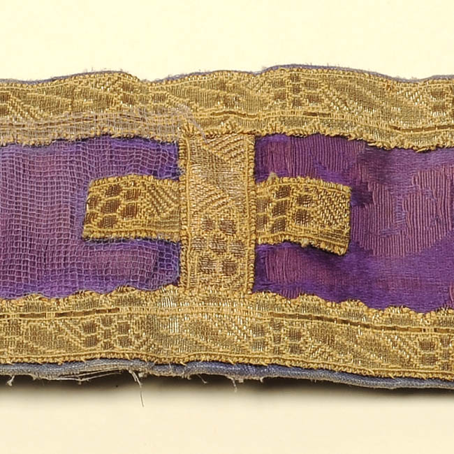 Textil de brocado de color violeta con colores verde, fucsias, lilas y dorados, con galón dorado y flecos de hilos metálicos dorados. Cordón trenzado color ocre y borla en algodón. Reverso textil cosido de damasco violeta. Banda de tela morada con diseño floral, extremos trapezoidales, destacados con gruesa cinta plateada y al centro una cruz, otra más pequeña al doblez; del extremo penden flecos plateados metálicos y al borde lleva delgada cinta plateada. Además, tiene sobrepuesto un tul Interior, tela morada y cuelga cordón doble, terminado en borla.