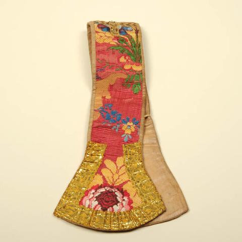 Banda de tela roja con diseño de flores y roleos, extremos más anchos, destacados con una gruesa cinta dorada metálica. Al doblez lleva pequeña cruz en cinta dorada.