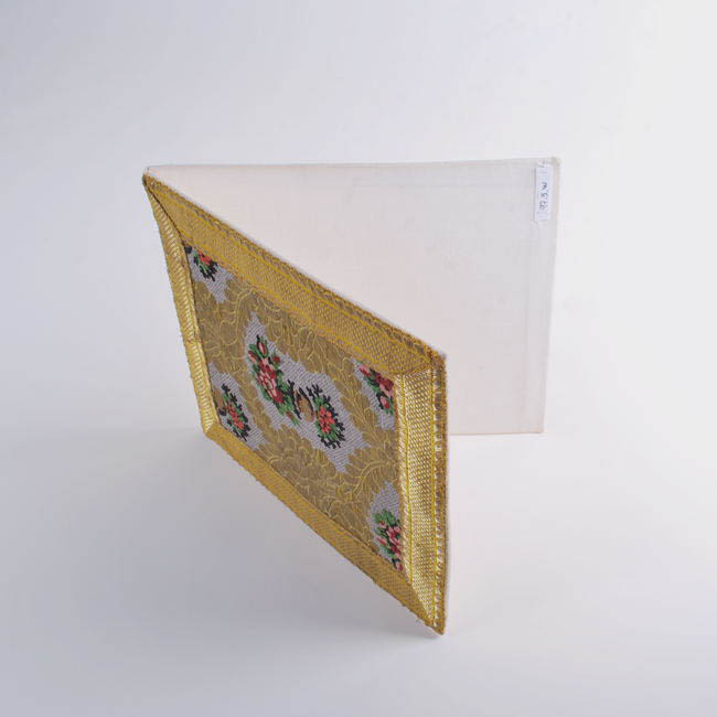 Textil de brocado cosido dorado con bordado en rojo, verde. Galón dorado, forro rosado y cartón. Pieza cuadrada formada por dos hojas rígidas, unidas en un borde formando una carpeta. Anverso forrado en tela dorada y blanca con pequeñas flores y los bordes destacados con una cinta gruesa dorada. Reverso, está forrado en tela amarilla. Interior de tela blanca.