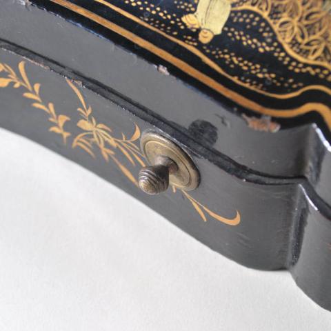 Madera lacada ensamblada y pintada con pigmentos y oro. Bronce. Pieza de formato rectangular, de color negro, rojo y dorado. Esta formado por dos partes unidas en un extremo por bisagras, presenta bordes mixtilíneos y ángulos en curva. Tableros frontales rectangulares con cuatro bajo relieves y cerradura metálica; la cubierta presenta tres niveles que enmarcan un recuadro central con paisaje oriental, caserío y personajes, dorado sobre fondo negro. La decoración repite un diseño de flores menudas. El interior esta forrado en tela negra y presenta un marco de cartón. Tablero inferior es plano de color negro.