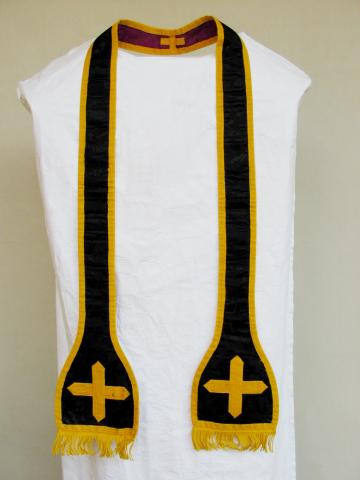 Textil de damasco negro cosido con aplicación de galón en amarillo. Reverso Textil de damasco color violeta con aplicación de galón amarillo. Flecos de hilos de seda amarillos. Banda de tela reversible, por un lado es de tela negra y el otro morado. Tiene los extremos más anchos, al centro presenta una cruz aplicada de cinta amarilla, y otra más pequeña al centro. Bordes, cinta y flecos amarillos.