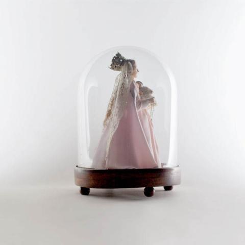 Figura femenina con traje rosa, posee corona y velo, así como también un rosario. Se encuentra sobre un pedestal de madera de cuatro patas, sobre la cual hay una cúpula de vidrio que la encierra. Madera tallada y policromada, torneada, textil de raso y encaje algodón, plata repujada. Cabello natural. Vidrio
