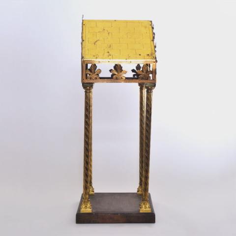 Mueble compuesto por cuatro columnas que sostienen un frontón triangular de interior calado, formando un arco trilobulado, con elementos vegetales; al borde sobresale crestería. Base de madera.