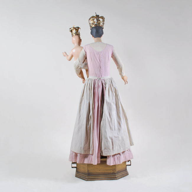 Escultura de candelero de la Virgen del Rosario con niño. Esta representada de pie y sostiene un niño en el brazo izquierdo. Ambos personajes son de carnaciones claras y ojos azules. La figura femenina lleva un vestido rosado sobre el cual tiene un faldón o delantal blanco, mientras el niño solo viste un pañal blanco. Ambos personajes llevan coronas doradas en sus cabezas.