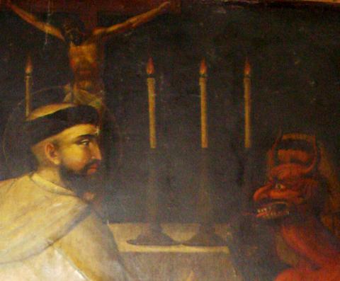 Obra de formato horizontal, representa a un grupo de personajes masculinos de vestimentas religiosa blanca. Al centro aparece figura principal, un hombre de pie frente a un personaje fabuloso, con cuernos, desnudo de color rojo, alado y con patas de animal. Plano de fondo, altar con candeleros, velas y crucifijo. Un fraile está recostado en medio de la sala capitular y recibe la penitencia, mientras que Santo Domingo amonesta al diablo.