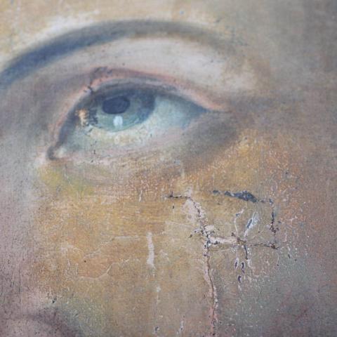 Obra bidimensional, representa el rostro de un personaje masculino. En primer plano y al centro, destaca rostro de aspecto juvenil, con la frente despejada, ojos claros que miran hacia arriba, boca menuda y mentón breve; tiene cabello oscuro. Al extremo inferior se visualiza parte de su vestimenta de color blanco y negro.