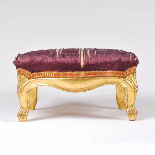 Mueble de asiento, de formato horizontal, patas cortas cabriolé. Tiene pasamanería color rojo y dorado entre tapiz y estructura de madera que está tallada y dorada. Como funda en la parte superior tiene tapiz de color rojo oscuro. Se utiliza para reposar los pies cuando se esta sentado.