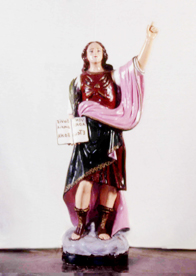 Obra exenta, composición en base a figura masculina de cuerpo entero de pie sobre una base gris con relieves. Su brazo derecho alzado, y el izquierdo recogido al costado del torso sosteniendo un libro abierto y una hoja. Tiene el cabello color marrón hasta los hombros y los ojos azules. Viste túnica de color rojo hasta las rodillas con mangas cortas ocre con borde dorado, sobre esta lleva un manto color verde y rosado con decoraciones doradas. En sus pies lleva sandalias.