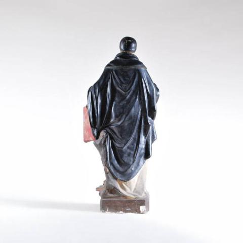 Figura humana que presenta un vestuario blanco con capa azulada. En una de sus manos presenta un libro y la otra posee un orificio para insertar un objeto anezo. Una de sus piernas se apoya en libros.