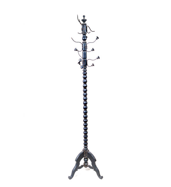 Elemento de soporte vertical de madera color negro, el cuerpo esta torneado con bolas. Tiene tres patas de madera caladas de perfil plano. En la parte superior tiene 10 fierros en forma de S con remates de madera torneados en los extremos. Sirve para colgar vestuario.