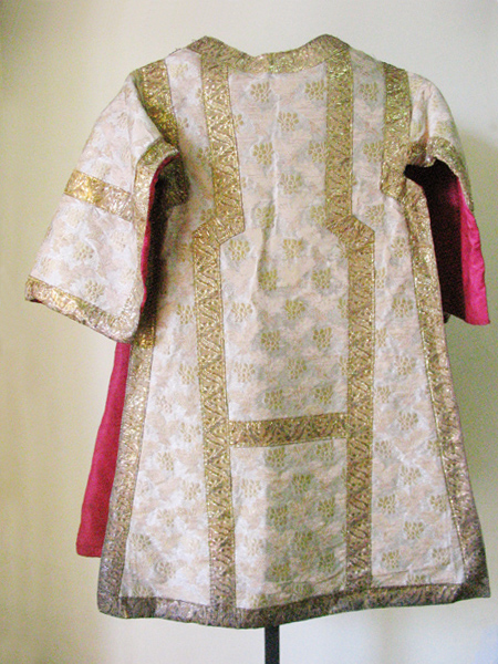 Textil cosido de brocado color dorado y blanco con aplicaciones de galones dorados. única abierta a los lados, de mangas anchas y corte trapezoidal; realizada en tela rosada y plateada, con figuras doradas. Ambas piezas similares, llevan aplicación de cinta metálica dorada, al centro dos franjas longitudinales y en los bordes. Interior, forro rojo.