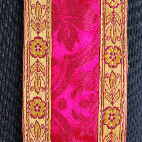 Banda de tela roja, brillante; estrecha y más amplia en los extremos inferiores, en ambas puntas presenta una cruz central confeccionada en cinta amarilla y roja con diseño vegetal. El borde esta destacado con una delgada cinta. La tela está tejida en diseño vegetal, grande de rojo oscuro sobre un fondo también rojo más brillante.