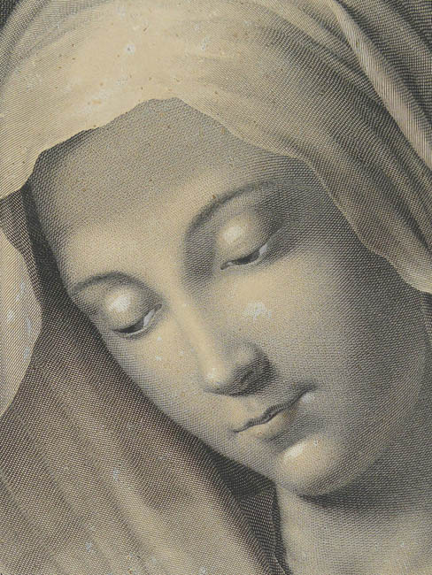 Retrato femenino con las manos sobre el pecho en actitud de oración, tiene la cabeza inclinada y el rostro sereno. Está cubierta por un manto y su vestimenta que cae en drapeados y le envuelve el cuerpo. No presenta marco.
