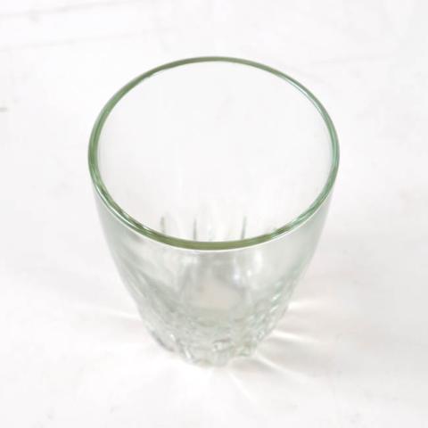 Contenedor cilindrico transparente, de boca amplia, cuerpo regular que decrece hacia el extremo inferior; de base más aguda, en ésta presenta una franja en relieve con decoración longitudinal.