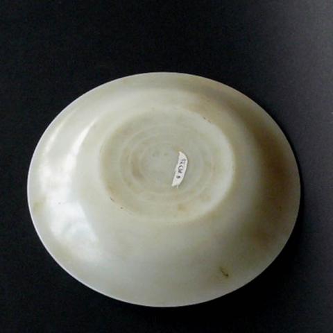 Recipiente circular, llano de vidrio opaco, con una pequeña concavidad central, marcada en circulo; borde elevado, liso sin decoración.
