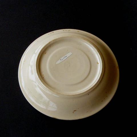Recipiente circular, de color blanco y decoración verde. presenta una leve concavidad, marcada al centro por un circulo bajo relieve; de borde elevado presenta una delgada franja verde. Reverso, presenta un zócalo circular y una forma circular al centro.