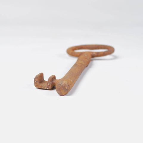 Llave tubular alargada, extremo proximal tiene empuñadura oval tubular de tamaño medio formando una figura interna de dos C opuestas. Tija con 3 cordones 2 finos y central mas grueso en primer tercio de zona proximal. En extremo distal tiene paletón con acanaladura en forma de corchete . De color café anaranjado con variación de color.