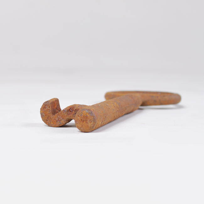 Llave tubular alargada, extremo proximal tiene empuñadura oval tubular de tamaño medio formando una figura interna de dos C opuestas. Tija lisa sin decoración y cerrada en extremo distal. En extremo distal tiene paletón en forma de S. De color café anaranjado con variación de color.