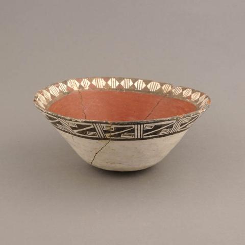 Puco campanuliforme. Vasija simétrica, no restringida, contorno simple. Borde directo evertido, labio convexo, cuerpo troncocónico inv., base plana irregular. Superficie exterior pulida, engobada blanco y decorada con pintura negra y roja en el borde. Superficie interior pulida, engobada rjo y también presenta el borde una banda decorada de color negro y blanco.