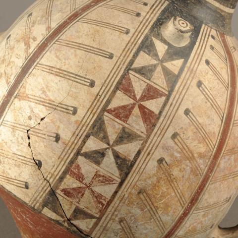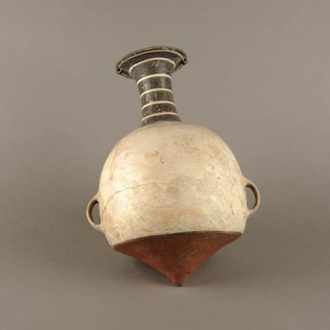 Vasija simétrica, restringida con cuello, contorno complejo. Superficie interio alisada, exterior pulida y decorada con diseños polícromos en toda su externsión, excepto la base que sólo presenta engobe rojo. Borde evertido con labio convexo, cuello hièrboloide, cuerpo ovoidal, base cónica invertida, par de asas verticales en arco de correa emplazadas cuerpo-cuerpo. Se registra un par de protúberos opuestos bajo el borde.