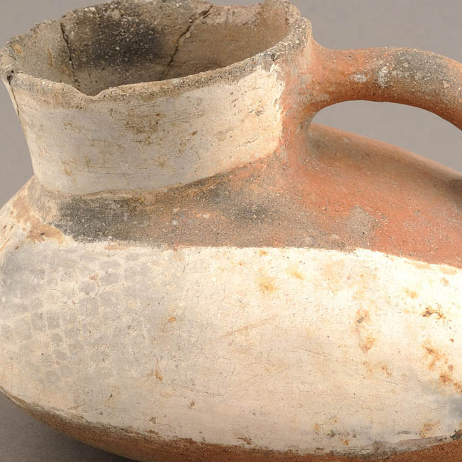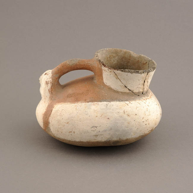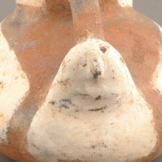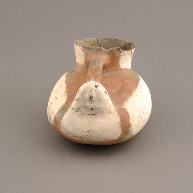 Jarro pato con modelado antropomorfo. Vasija asimétrica, restringida con cuello, de perfil compuesto. El borde es levemente evertido con labio convexo, cuerpo ovoide horizontal, cuello troncocónico invertido, base convexa-cóncava y un asa puente en arco lisa o circular emplazada cuello-modelado antropomorfo. Opuesto al cuello presenta una cabeza antropomorfa modelada con protúberos en la nariz y mentón. La superficie exterior está pulida y estuvo pintada sobre bandas de engobe blanco; la superficie interior está alisada.