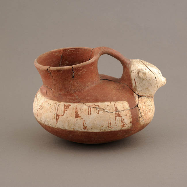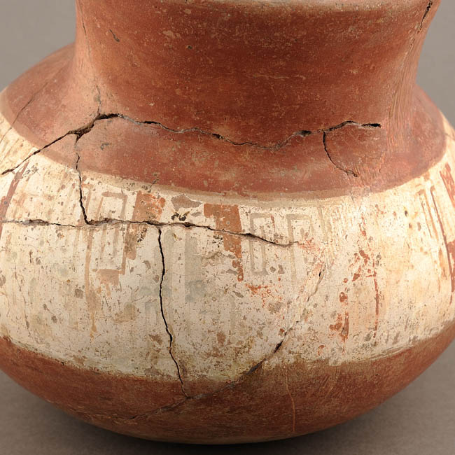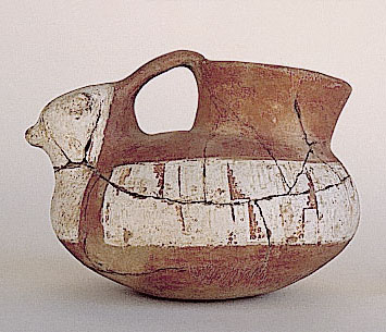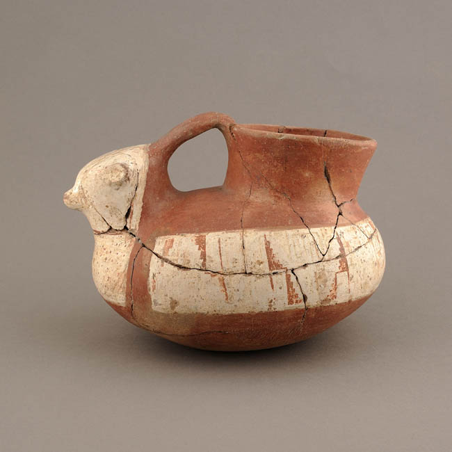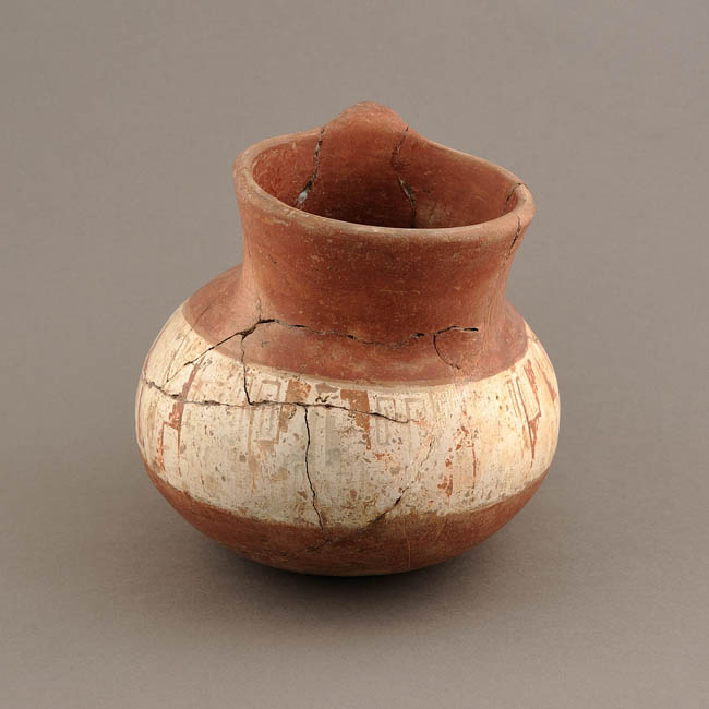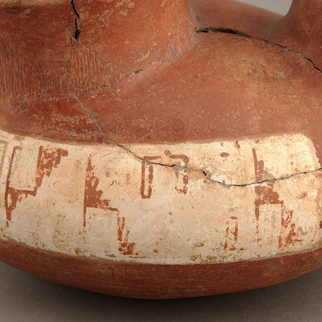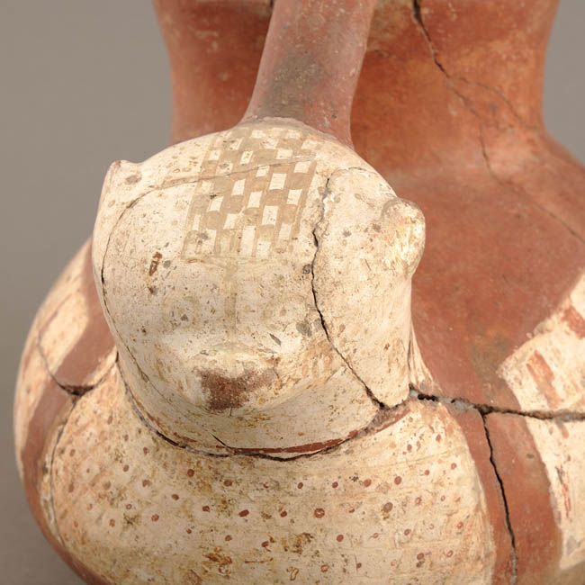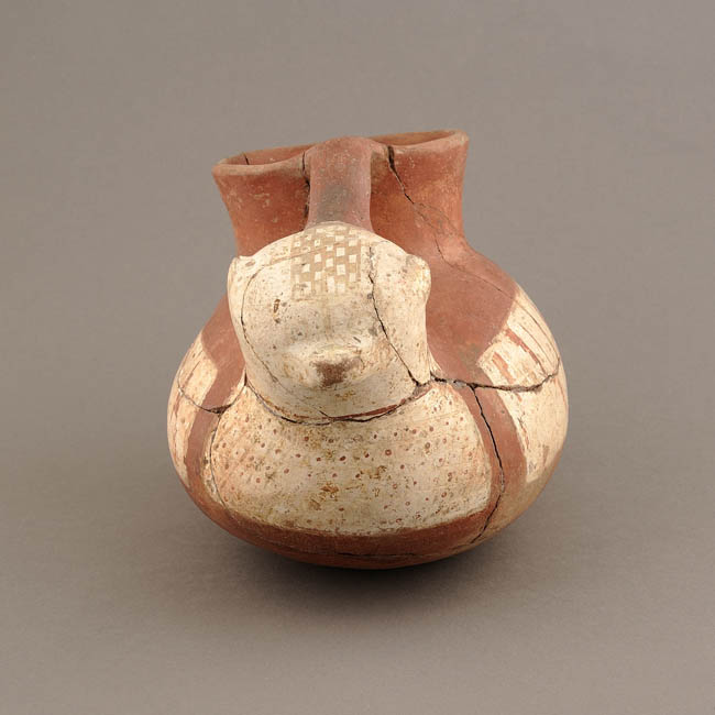 Vasija asimétrica, restringida con cuello, de perfil compuesto. El borde es evertido con labio convexo, cuello troncocónico invertido, cuerpo elipsoide, asa puente en arco de correa emplazada labio-falso gollete y base convexo-cóncava. La superficie interior está alisada; la exterior está pulida y pintada blanca y rojo sobre engobe rojo, tanto en el cuerpo como en el rostro modelado. Dicho modelado corresponde a una cabeza zoomorfa con protúberos adheridos que semejan orejas y boca.