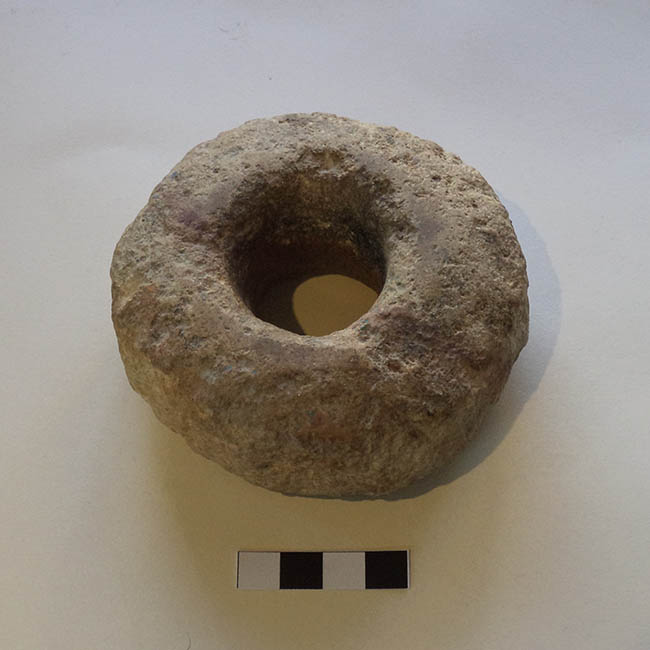 Instrumento de forma cilíndrica, de bordes rectos, con perforación bicónica en el sector central. Se encuentra elaborado de piedra pulida de color gris claro.