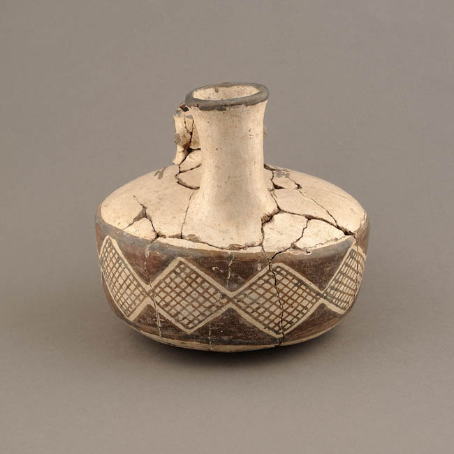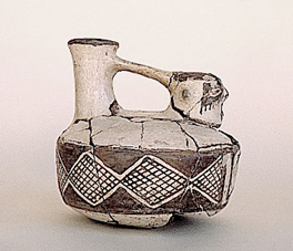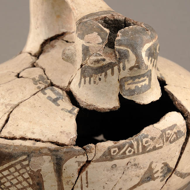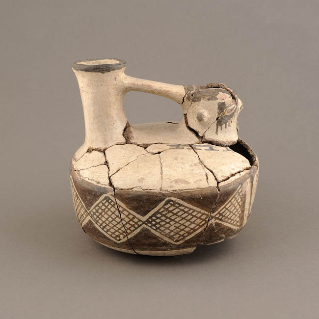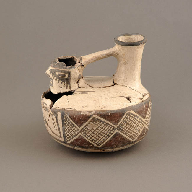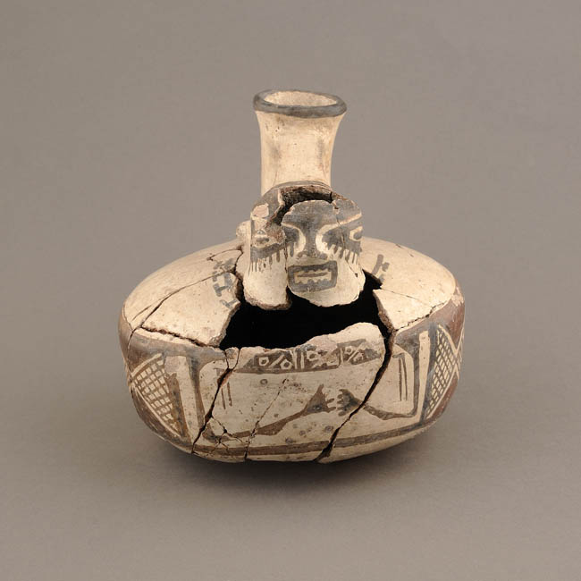 Vasija asimétrica, restringida con cuello, de perfil complejo. El borde es evertido con labio convexo, cuello y cuerpo subcilíndricos, base subesférica, asa puente en arco de correa emplazada cuello-falso gollete modelado. Este presenta forma cefálica antropomorfa con protúberos adheridos que semejan orejas, una nariz y mentón. La superficie interior está alisada; la exterior está pulida y presenta una banda decorada con pintura café y negra sobre engobe blanco, y también registra pintura en el modelado.