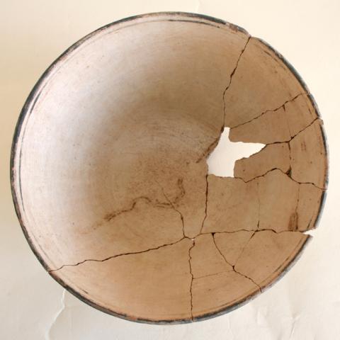 Contenedor abierto de perfil simple. Tiene labio redondeado, cuerpo troncocónico invertido y base plana. Se encuentra pintado interior y exteriormente de color blanco, y decorado con un triángulo invertido y un rectángulo reticulado, ambos en líneas de color negro. Cerámica modelada, alisada y pintada. Este objeto es pareado con el número de inventario 1287.