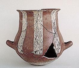 Vasija simétrica, restringida con cuello, de perfil inflectado. El borde es evertido con labio convexo, cuello subcilíndrico, cuerpo esférico, base convexo-cóncava (falso torno) y un par de asas horizontales en arco de correa emplazadas en el cuerpo. La superficie exterior está pulida y presenta franjas decoradas con diseños negros sobre blanco, las cuales a su vez están rodeadas por engobe rojo.