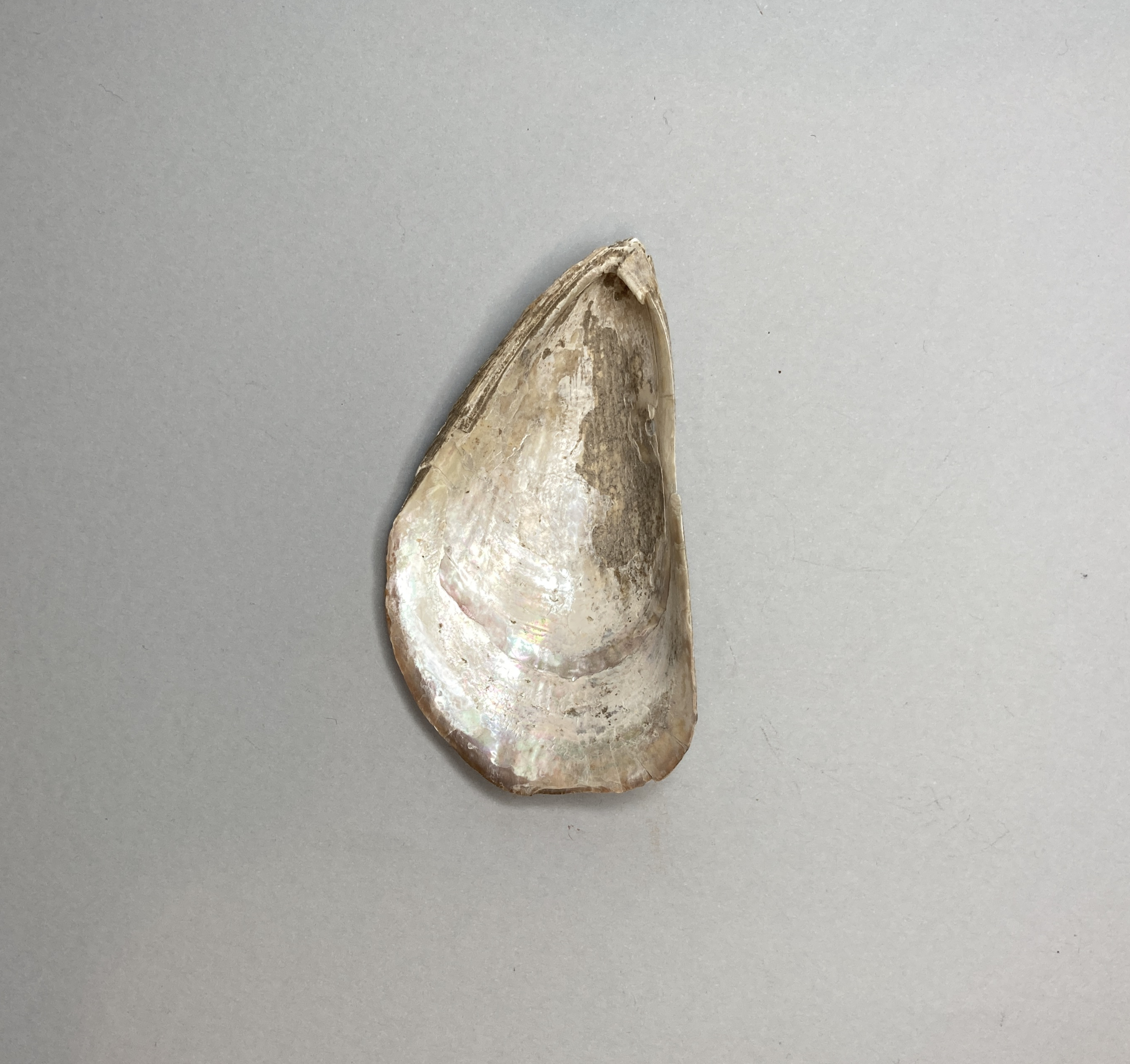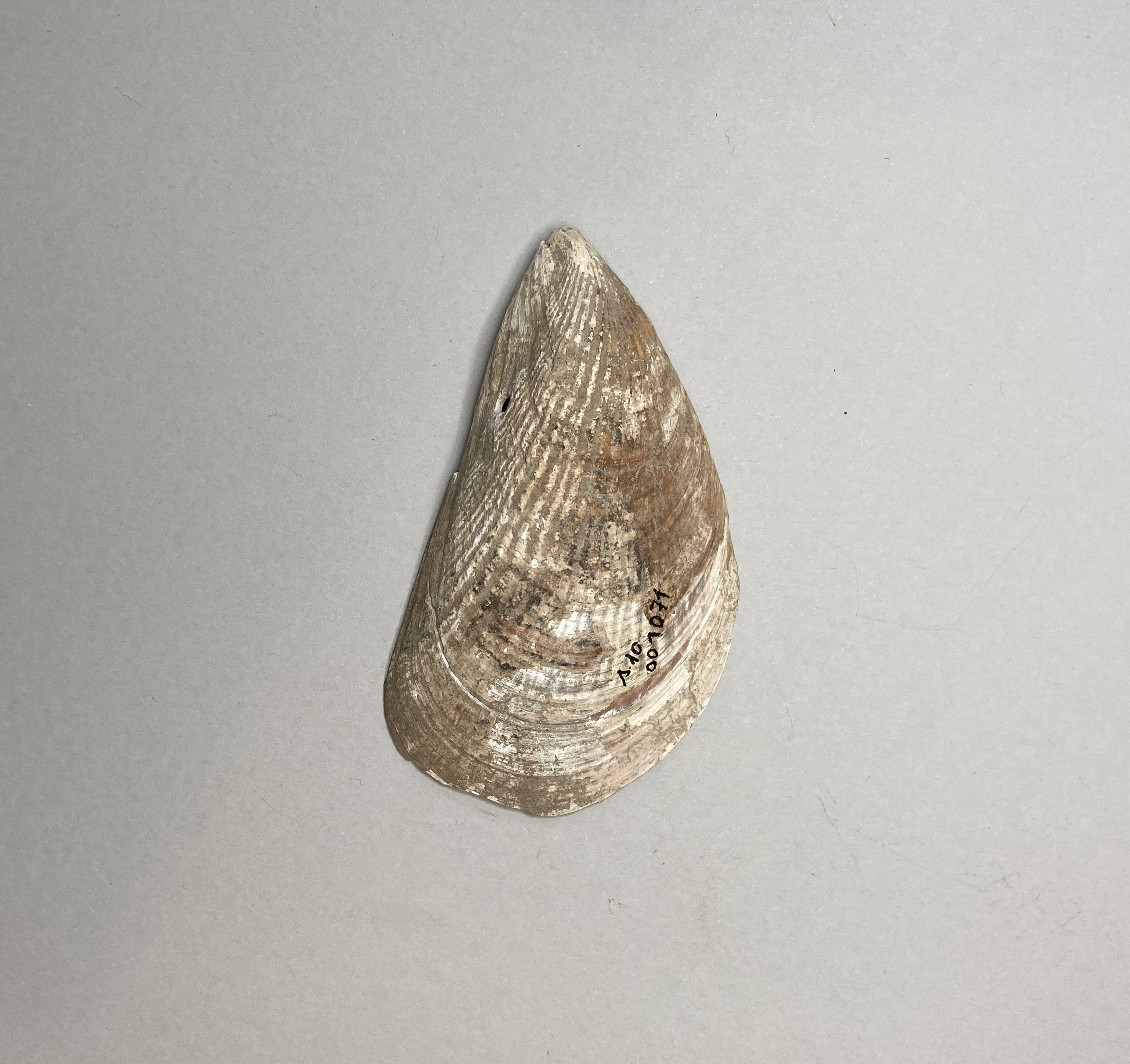 Elemento malacológico correspondiente a una valva de molusco. La concha es mitiliforme, con dorsal prominente desde la mitad hacia el umbo, presenta estrías de crecimiento concéntricas y ranuras perpendiculares (costillas radiales). El dorso es de color marrón claro, con manchas marrón oscuro y negro, mientras que el interior es nacarado. Presenta una perforación en la mitad superior del costado izquierdo. En la parde derecha del dorso, cerca del margen posterior presenta un inscripción con tinta negra que señala "s.10" y bajo esta inscribe "001071". Corresponde a una valva de la espacie Aulacomya atra, conocida comunmente como cholga.
