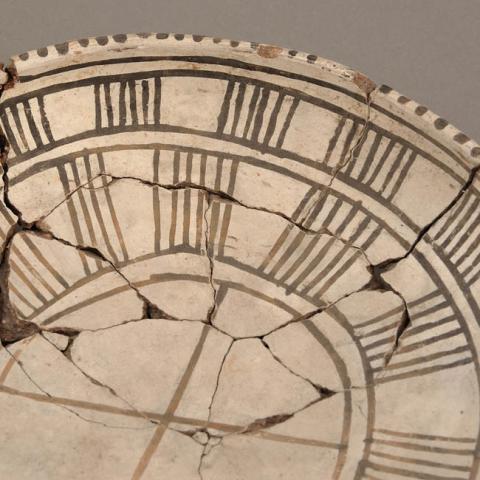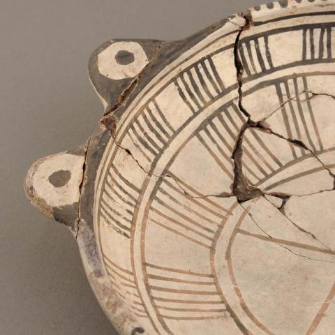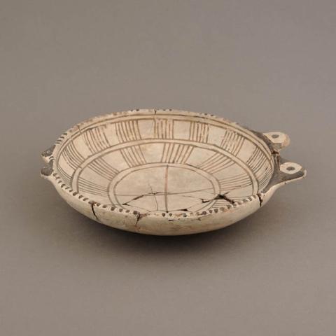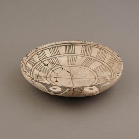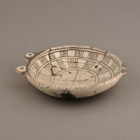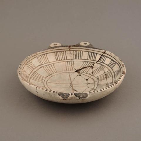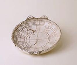 Plato zoomorfo. Vasija simétrica, no restringida, contorno simple. Superficie exterior pulida y engobada blanco; superficie interior pulida y pintada negro y café sobre engobe blanco. Borde directo con labio convexo, cuerpo semiesférico,base plana (pero sin quiebre con el cuerpo). Además se se registran dos pares de protúberos opuestos, aheridos al borde de la pieza, semejando posiblemente ojos y patitas. Es pieza gemela con la 00152.