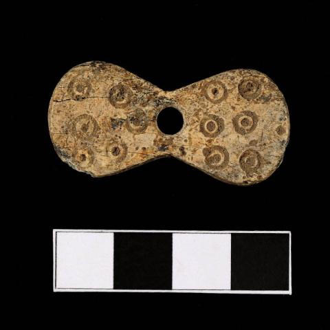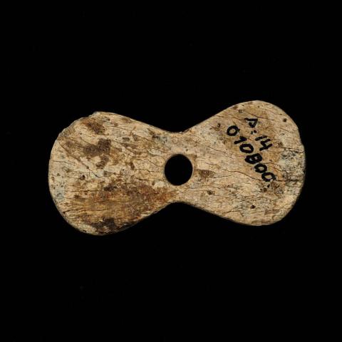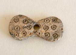 Instrumento utilizado en conjunto con el huso de hilar para fabricar la hebra. Objeto en forma de dos cilindros unidos con orificio en el sector central. Superficie pulida de color marrón claro decorado con pequeños círculos concéntricos incisos en una de sus caras.