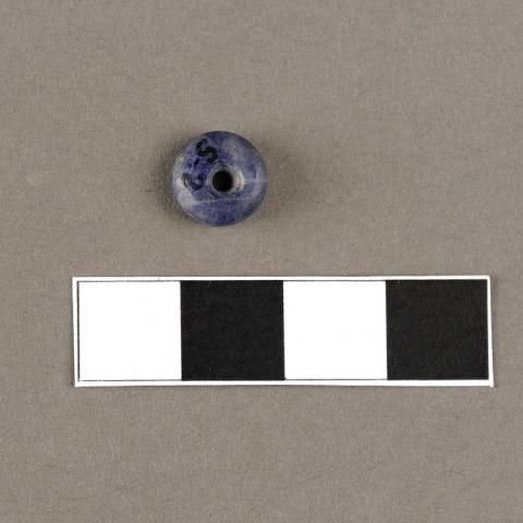 Adorno de uso personal que se lleva pendiente de un cordel o como parte de una collar. Objeto de forma cilíndrica con perforación en el sector central. Superficie pulida de color azul claro.