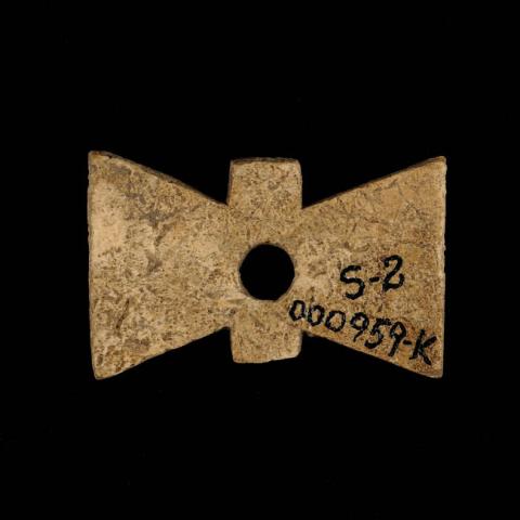 Instrumento utilizado en conjunto con el huso de hilar para fabricar la hebra. Objeto de forma bitroncocónica, con una banda vertical en la que se encuentra el orificio central. Superficie pulida de color marrón claro.