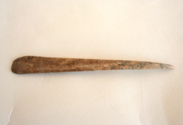 Instrumento de uso doméstico de forma alargada y sección plana con un extremo apuntado y otro planom con muescas en el borde.Superficie rugosa de color marrón.