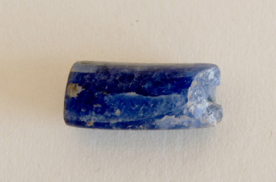 Adorno de uso personal que se lleva pendiente de un cordel o como parte de un collar. Objeto de forma tubular. Superficie pulida de color azul con vetas blancas.