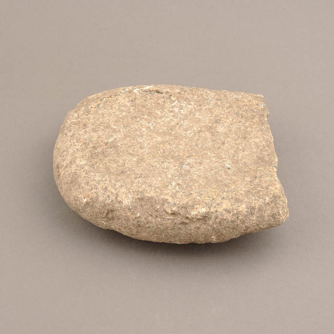 Guijarro discoidal de forma subcuadrangular y sección cóncava-convexa. La cara cóncava (anverso) presenta evidentes huellas de pulimento que sugieren uso de molienda como mortero. La cara convexa (reverso) también muestra este tipo de huellas que sugieren uso como mano.