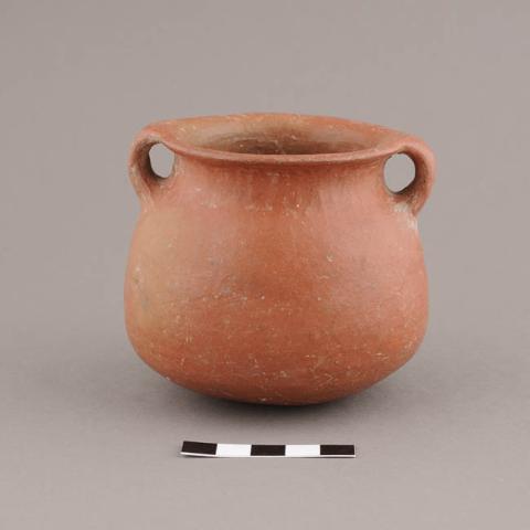 Mini-olla. Vasija simétrica, restringida con cuello, contorno complejo. Superficie exterior pulida y engobada rojo; superficie interior alisada, excepto borde y cuello que presentan engobe. Borde evertido con labio convexo, cuello hiperboloide, cuerpo subesférico, base convexa, asas verticales en arco de correa emplazadas labio-cuerpo.