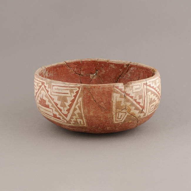 Vasija simétrica, no restringida, de perfil simple. El borde es directo con labio recto, cuerpo semiesférico y base convexa-cóncava (falso torno). Ambas superficies están pulidas: la interior posee engobe rojo; la exterior presenta la base con engobe rojo y el sector superior está decorado con dos bandas pintadas con motivos negros y rojos sobre engobe blanco. El labio está pintado negro.