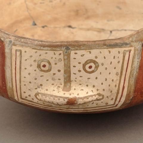 Puco zoomorfo. Vasija simétrica, no restringida, de perfil compuesto. El borde es directo con labio convexo, cuerpo subcilíndrico y base subesférica. Ambas superficies están pulidas: la interior presenta engobe blanco; la exterior posee decoración en campos con pintura polícroma, destacando un rostro zoomorfo. Estos campos están delimitados por engobe rojo, al igual que la base. Se registra un protúbero bucal adherido al rostro pintado y un par de protúberos semicirculares adheridos en el labio sobre los diseños laterales. En la pared opuesta al diseño facial presenta un protúbero que semeja una cola. El labio de la pieza está pintado negro.