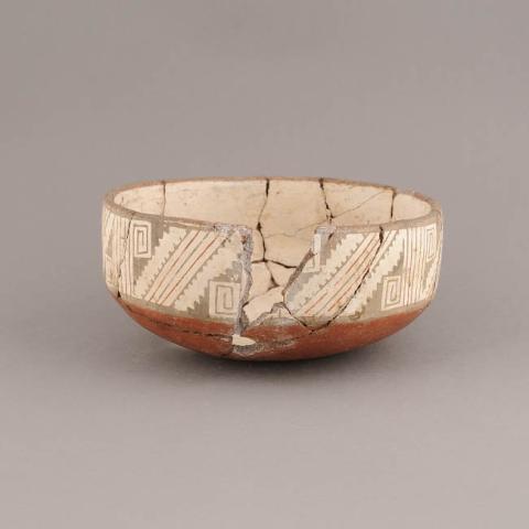 Vasija simétrica, no restringida, de perfil compuesto. El borde es directo con labio convexo, cuerpo cilíndrico y base subesférica. Ambas superficies están pulidas: la interior posee engobe blanco; la exterior presenta la base con engobe rojo y el sector superior está decorado con una banda pintada con motivos continuos negros y rojos sobre engobe blanco. El labio está pintado negro.