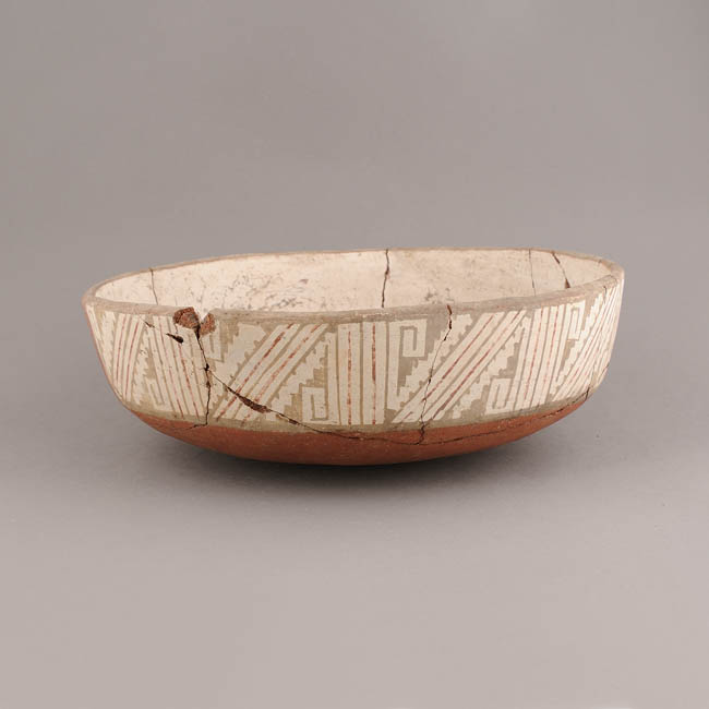 Vasija simétrica, no restringida, perfil compuesto. Borde directo levemente evertido con labio convexo, cuerpo subcilíndrico y base subesférica. Ambas superficies están pulidas: la interior está decorada en la base con unos círculos concéntricos negro y rojo sobre engobe blanco; la exterior presenta la base con engobe rojo y el sector superior está decorado con una banda de motivos polícromos sobre engobe blanco. El labio de la pieza está pintado de un color oscuro.